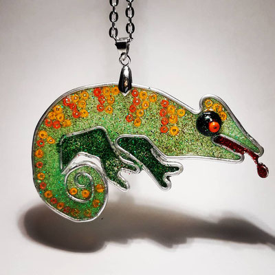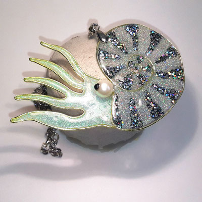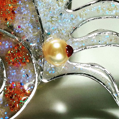 Die Brosche besteht aus einem großen Scarabäus, der ein kreisförmiges Amulett festhält. Das Amulett ist mit einem eigenen, nachbearbeiteten Foto von altwiener Zinshausfliesen unterlegt.